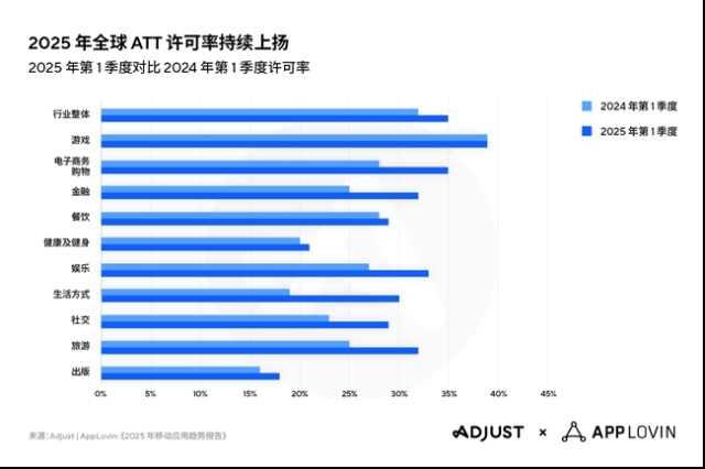 与此同时,ATT (App Tracking Transparency) 许可率也在稳步攀升。预计2025年1季度,全球平均许可率将从 32% 提升至 35%。这不仅表明用户信任度正在逐步增强,还显示出用户对个性化广告价值的认可。此外,游戏类应用的 ATT 许可率最高,达到 39%,而电商和购物应用也从 28% 跃升至 35%。