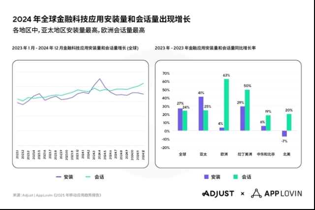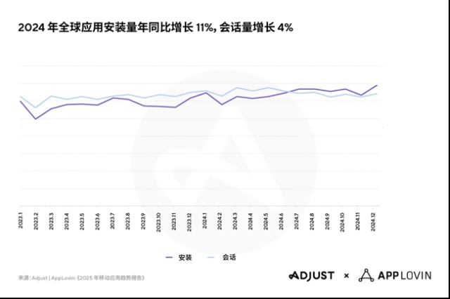 中国北京,2025 年 2 月26日讯-- 领先的数据监测与分析公司 Adjust 今日发布《2025 年移动应用趋势报告》。报告显示在经历 2022 年低谷期后,移动应用经济呈现出强劲的增长势头。2024 年全球应用安装量年同比增长 11%,会话增长 4%。此外,报告不仅融入了 AppLovin 专家的建议,还探讨了影响移动应用行业的关键趋势以及监测领域的未来,尤其是人工智能 (AI) 将如何定义营销活动和监测推广活动表现。