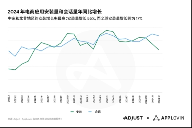 -电商在各地区的发展迅速。2024 年的安装量和会话量年同比增长分别达 17% 和 13%。中东和北非地区的表现最为瞩目,安装量和会话量分别高达 55% 和 21%。