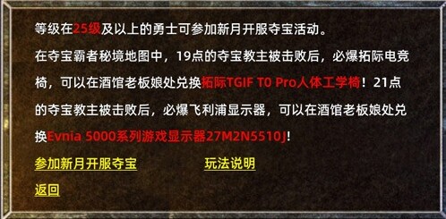 等级在25级及以上的勇士可参加“新月”“流云”开服夺宝活动。夺宝活动连开8天,电竞椅,显示器等你来爆!