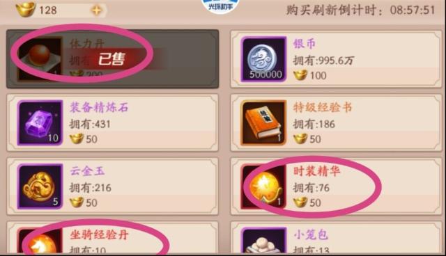 二、普通商店,体力丹必须每天拉满,等级重中之重,等级上去了其他的一切才能展开。时装精华、坐骑经验丹你有就每天拉满,详情可以看升级属性有大量加成。
