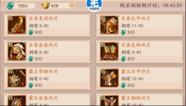 六、冒险商店,前期千万别买紫色装备,存起来买橙色的凑够2套霸王,2套万兽就够了。多的继续存起来等级买红色。