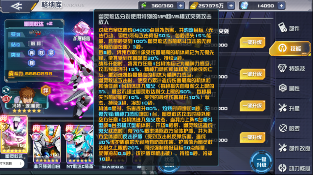 队长技【死亡先锋】,则能上场时就为我方所有机体增加能量,所有格斗型和多模式型机体攻击频率额外增加40%。而缘分技【宇宙海盗】,当满足特定的机体上阵条件时,幽灵敢达能够大幅提升自身及队友的能量回复速度,让整个队伍在战场上如虎添翼。如果使用机师技能,更能直接提升自身81%的属性!