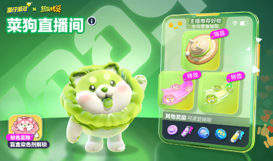 菜狗直播间开启,萌翻全岛的白菜狗登场!柔软的嫩绿色菜叶层层包裹,肉肉的脸颊透出健康的粉红,3月14日(周五)起,参与抽奖即可解锁联动外观<白菜狗>,使用盲盒染色剂,即可解锁<白菜狗▪粉色>,还有超萌的背饰、滚动特效等你来拿~