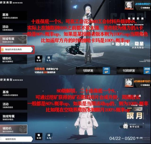 顺便以上研发池,在对应角色出场的时候会将对应角色设置为100%概率up,比如基准池在上一个A卡版本迷境刻痕的时候,抽21号是100%概率up,独域机体、辅助机同理。