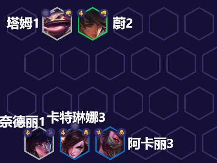 阵容组成:塔姆(福星天选)、蔚、奈德丽、阿卡丽、卡特琳娜