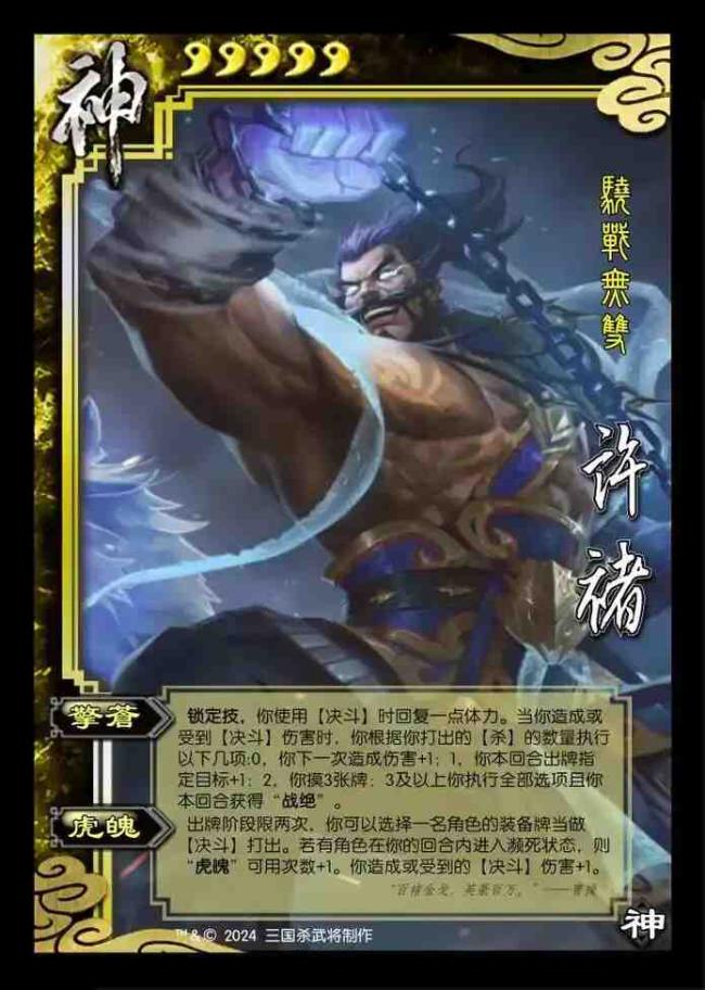 技能:“武神”(红桃手牌只能当成“杀”来使用)和“武魂”(在受到伤害后可以给对方留下一个梦魇标记,当自己阵亡时梦魇标记最多的角色会进行判定,判定牌不是“桃”和“桃园结义”则会一起阵亡)。